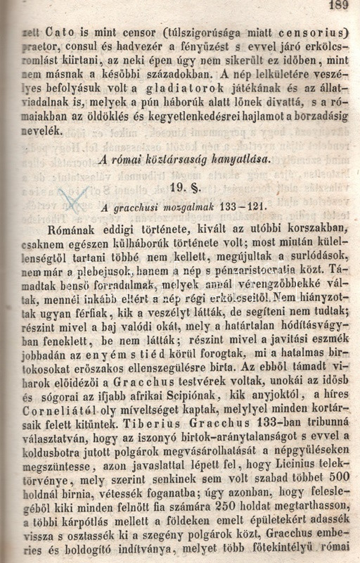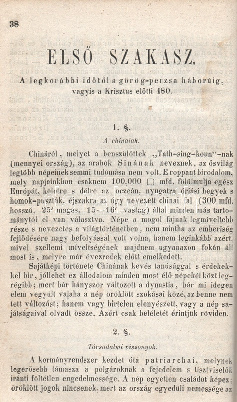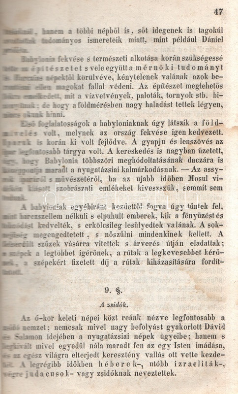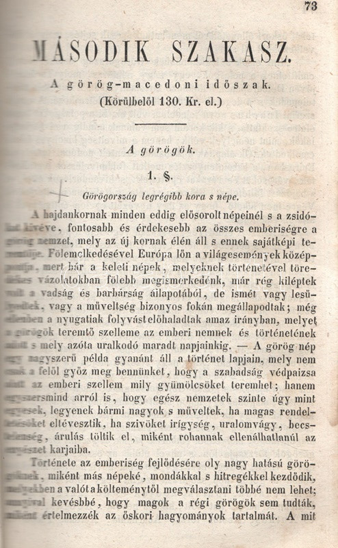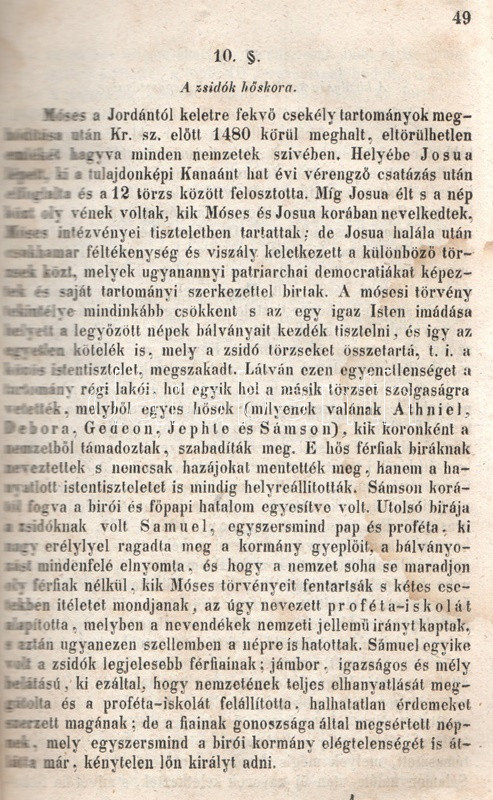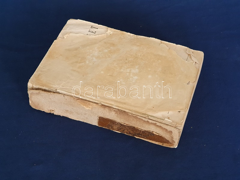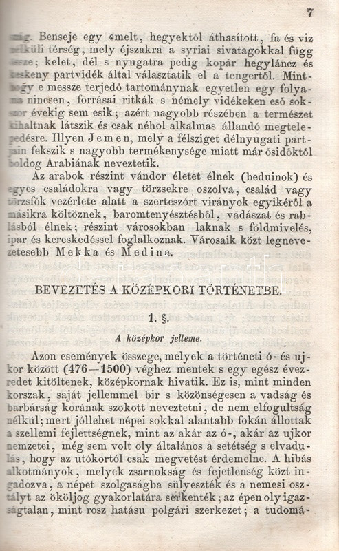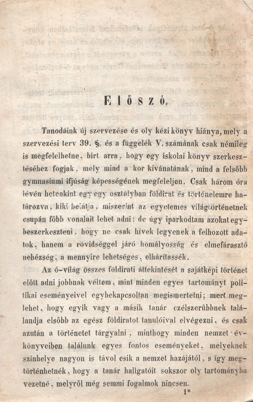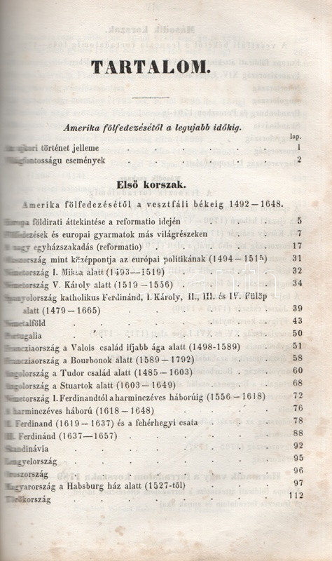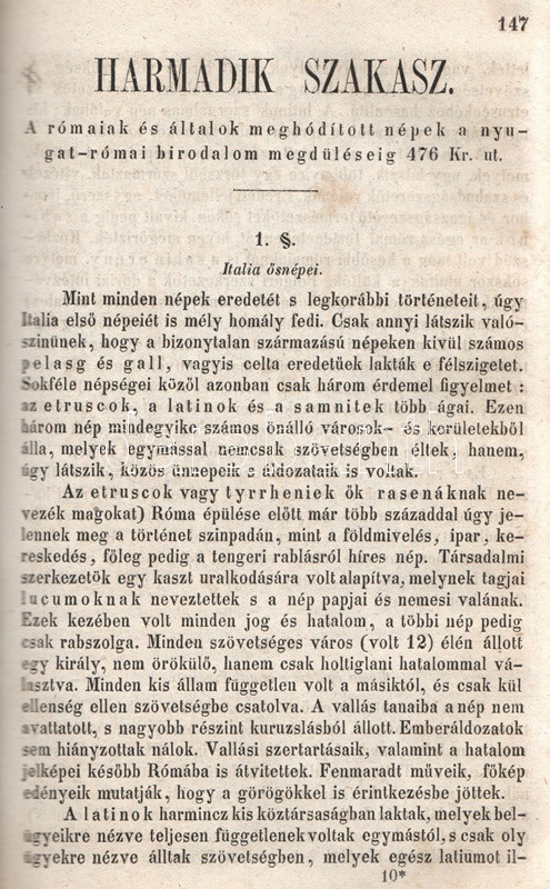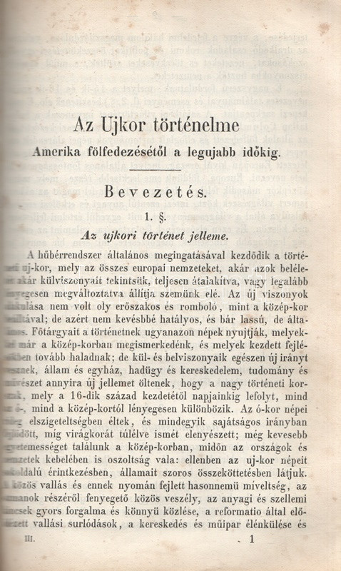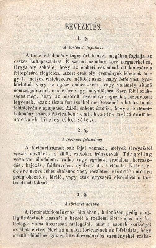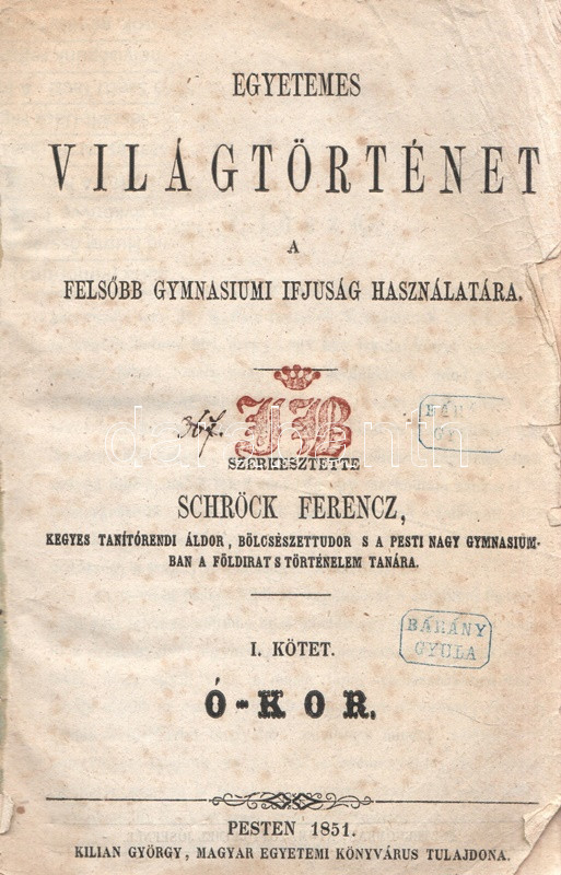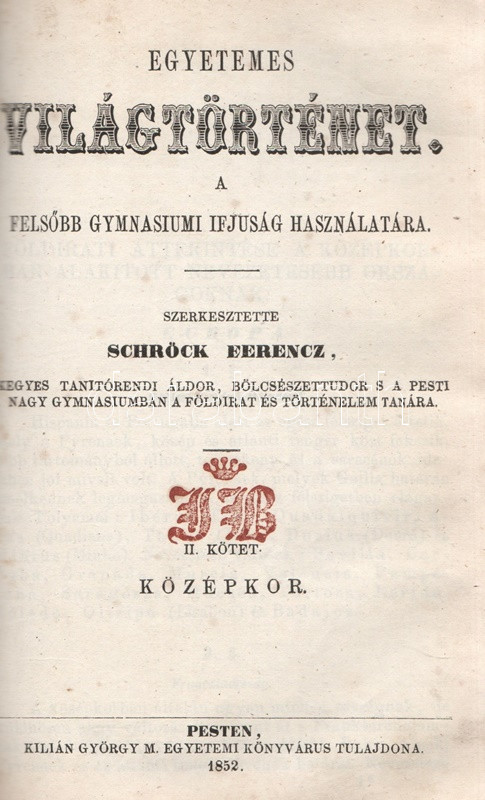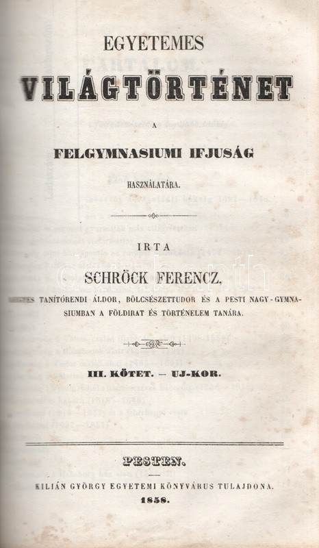 Schröck Ferenc: Egyetemes világtörténet a felsőbb gymnasiumi ifjúság használatára. I-III. kötet: Ó-kor. Középkor. Új-kor. [Teljes mű, egybekötve.] Pesten, 1851-1858. Kilian György magyar egyetemi könyvárus tulajdona (Beimel József ny., Esztergomban; Lukács László ny., Wigand Károly Fridrik ny., Pozsony). 238 + [6] p.; 219 + [1] p. V + [1] + 260 p. Első, illetve második kiadás. Schröck Ferenc (1813-1879) piarista tanár, történész, tartományi főnök. Tatán, Budán, Vácott tanított, 1849-ben hazafias érzelmei miatt néhány évre eltanácsolták a tanítástól. 1851-től Pesten tanított, igen népszerű történelmi előadásait a gimnáziumi diákok mellett pesti polgárok is látogatták. Schröck Ferenc egyetemes történeti áttekintése a politikai eseménytörténetre fókuszál, de nem mellőzi a történelem népéleti, társadalomtörténeti aspektusait sem. A mű az ókort a keleti államok kezdeteitől a Római Birodalom bukásáig, a középkort Amerika felfedezéséig, az újkort a napóleoni háborúk végéig tárgyalja. A szerző a magyarság történetét nem különíti el az egyetemes történelem folyamataitól, és korántsem nyugat-európai fókuszú, indokolt esetben bőséggel tárgyalja Kelet-Európa és Skandinávia eseményeit is. A népszerű munka számos új kiadást megélt, első két része az első, a harmadik rész a második lenyomatból származik. Példányunk első és második címoldalán régi tulajdonosi bélyegzések, néhány oldalon halvány foltosság, az utolsó levélen kisebb gyűrődés és hiány, a gerincnél erősítés. Fűzve, sérült, hiányos kiadói borítóban, fedőborítók nélkül, hiányos gerinccel.