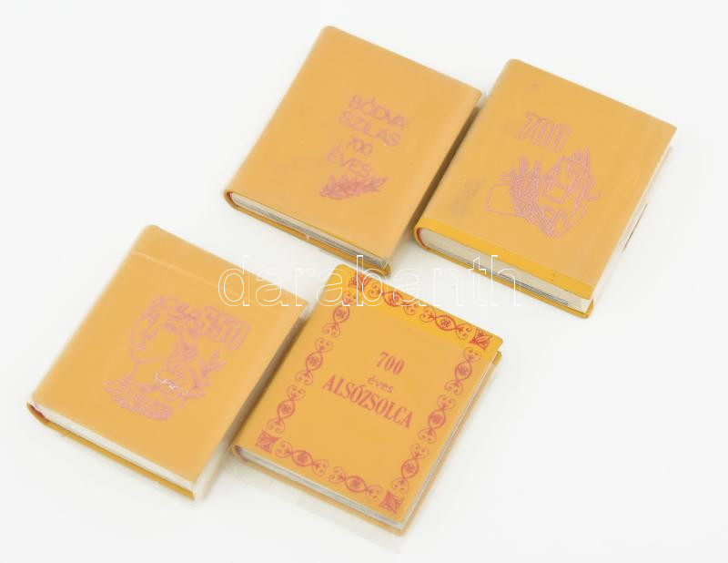 Vegyes, borsodi településekkel kapcsolatos helytörténeti minikönyvtétel, 4 db: Dénes György: Bódvaszilas 700 éves. Miskolc, 1978, Miskolci Miniatűr Könyvgyűjtők Klubja. Kiadói egészvászon kötés. Számozott (765./800) példány. Kereskedelmi forgalomba nem került. Alsózsolca 700 éves. Szerk.: Kovács Mihály. Miskolc, 1981, Miskolci Miniatűr Könyvgyűjtők Klubja. Kiadói egészvászon kötés. Megjelent 600 példányban. Kereskedelmi forgalomba nem került. Csorba Csaba - Seresné dr. Szegőfi Anna - Tóth Péter: Tiszakeszi 650 éves. Miskolc, 1983., Miskolci Miniatűr Könyvgyűjtők Klubja. Kiadói egészvászon kötés. Megjelent 800 példányban. Kereskedelmi forgalomba nem került. Répási Imre: Putnok 700 éves. Miskolc, 1983., Miskolci Miniatűr Könyvgyűjtők Klubja. Kiadói egészvászon kötés. Számozott (113./400), piros számozással. Kereskedelmi forgalomba nem került.