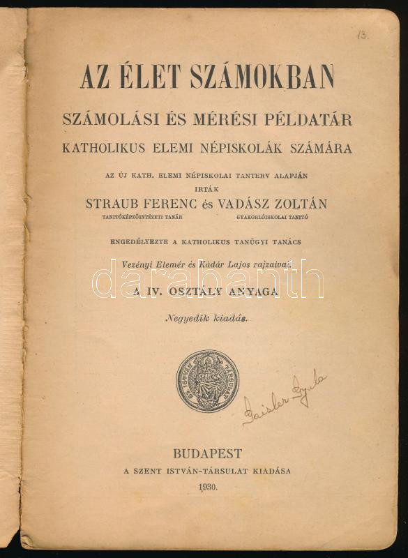 Straub-Vadász: Az élet számokban. Számolási és mérési példatár katolikus elemi népiskolák számára. Bp., 1930, Szent István Társulat. Kiadói papírkötés, viseltes állapotban.