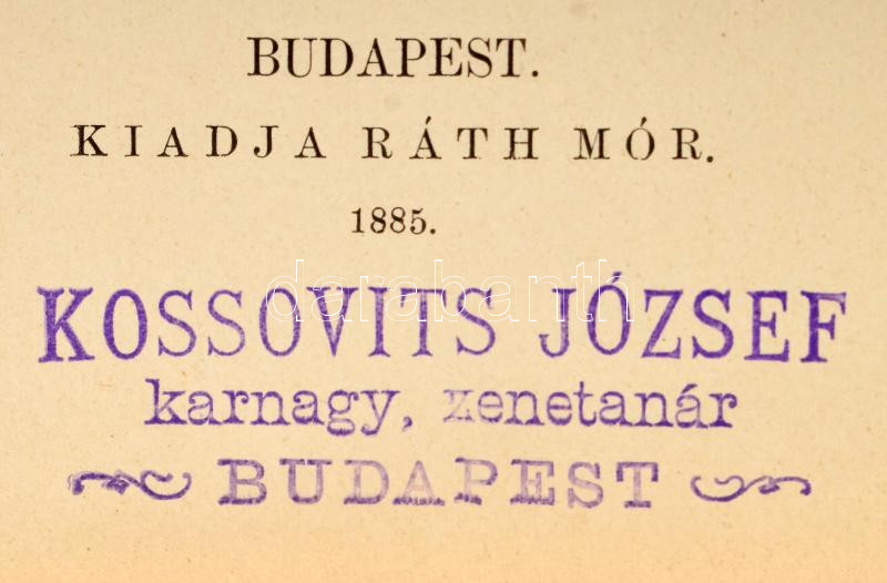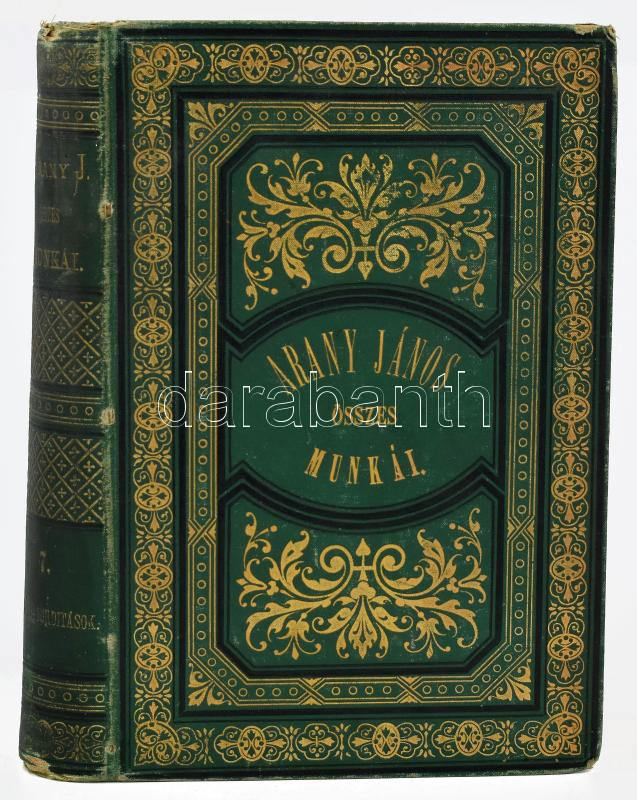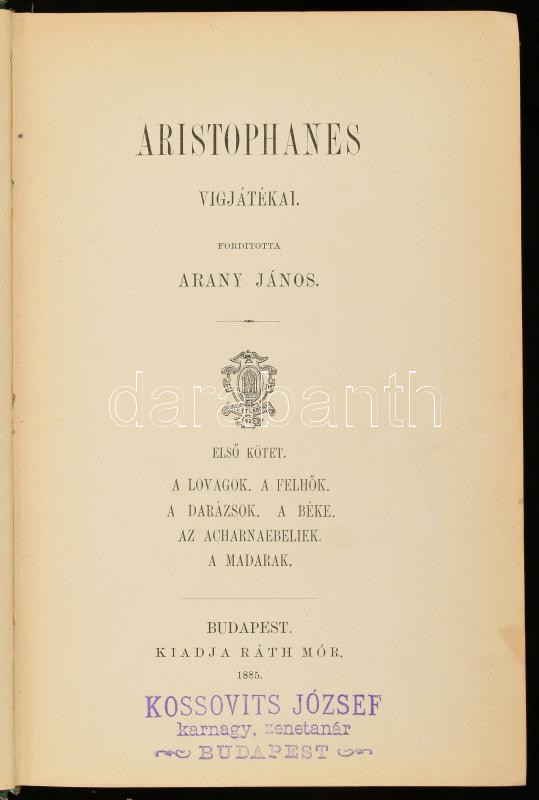 Arany János összes munkái. VII. kötet: Aristophanes vÃgjátékai. Ford.: Arany János. 1. köt. Bp., 1885, Ráth Mór, XXIX+(3)+591 p. Kiadói gazdagon aranyozott egészvászon sorozatkötés, márványozott lapélekkel, a borÃtón és a gerincen kis sérülésekkel, kopással, néhány kissé sérült lappal, kijáró elülsÅ‘ szennylappal. Kossovits József karnagy, zenetanár névbélyegzÅ‘jével.