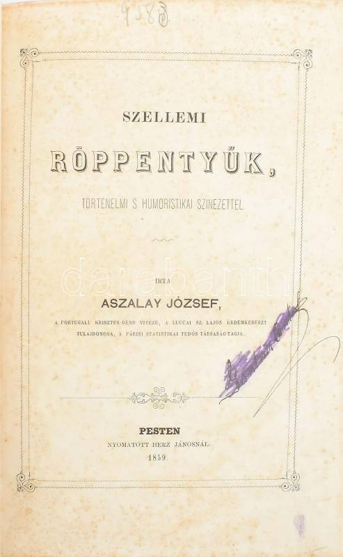 Aszalay József: Szellemi röppentyűk, történelmi s humoristikai szineze... https://www.darabanth.com/en/477-Online-auction/477.0/Books/Books-Other-rarities~2000020/Aszalay-Jozsef-Szellemi-roppentyuk-tortenelmi-s-humoristikai-szinezettel-Pest-1859-Herz-JC3~II3254006