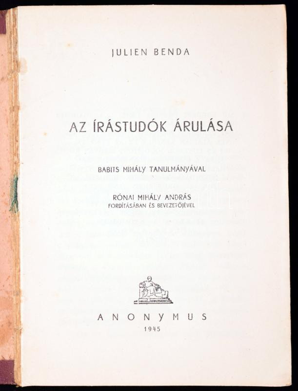 Benda, Julien: Az írástudók árulása. Babits Mihály tanulmányával. Ford... https://www.darabanth.com/en/477-Online-auction/477.0/Books/Books-Other-rarities~2000020/Benda-Julien-Az-irastudok-arulasa-Babits-Mihaly-tanulmanyaval-Ford-es-a-bev-irta-RC3~II3249320