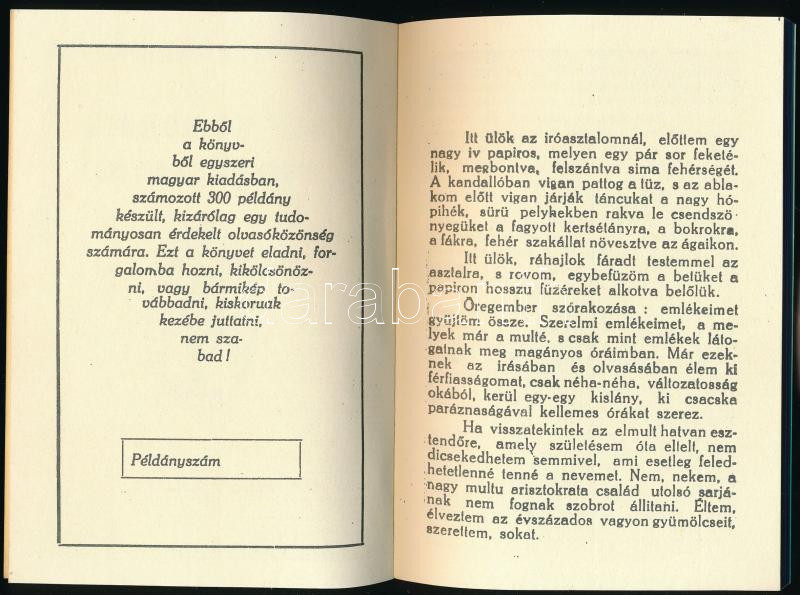 Ebből a könyvből egyszeri magyar kiadásban, számozott 300 példány készült. Ez a példány számozatlan.
