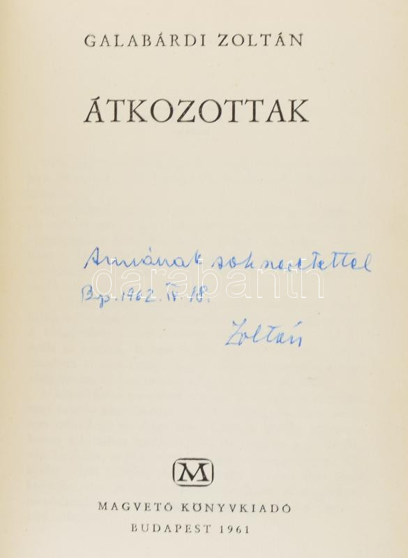 https://www.darabanth.com/en/477-Online-auction/477.0/Books/Books-Other-rarities~2000020/Galabardi-Zoltan-Atkozottak-DEDIKALT-Bp-1961-Magveto-Kiadoi-felvaszon-kotes-kisse~II3242634