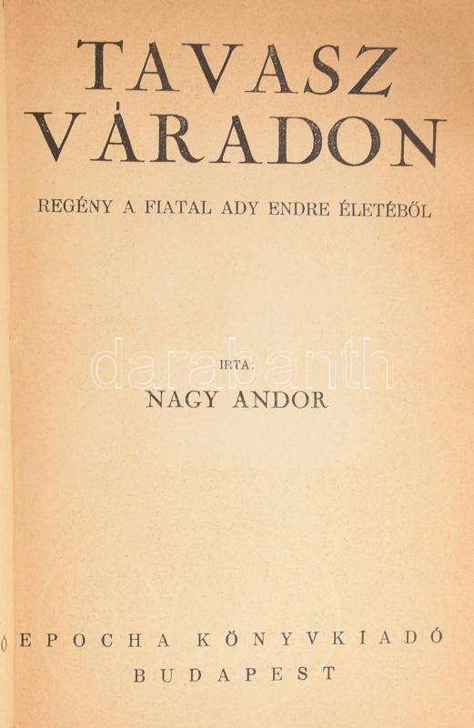 Nagy Andor: Tavasz Váradon. Regény a fiatal Ady Endre életéből. Bp., é... https://www.darabanth.com/en/477-Online-auction/477.0/Books/Books-Other-rarities~2000020/Nagy-Andor-Tavasz-Varadon-Regeny-a-fiatal-Ady-Endre-eletebol-Bp-en-Epocha-Kiadoi-ara~II3253924