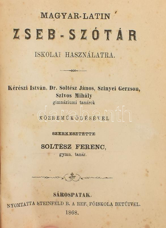 Soltész Ferenc (szerk.): Magyar-latin zseb-szótár iskolai használatra. Kérészi István, Soltész János, Szinyei Gerzson, Szivos Mihály közreműködésével szerk. - - . Sárospatak, 1868, Steinfeld B.-ny., 3 sztl. lev.+ 1536 (hasábszámozás). Átkötött félvászon-kötésben, kissé viseltes borítóval, kissé foltos lapokkal.