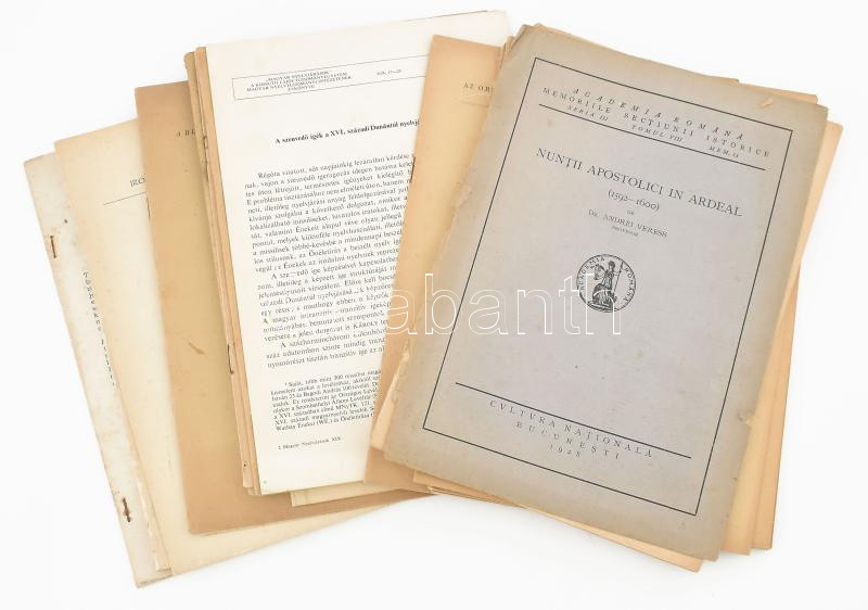 cca 1928-1973 Vegyes különlenyomat tétel, 16 db: Benczédi László: Parasztság és kurucság a Thököly-korban (1964); Erdei Aranka: Adatok Békés megye 1826/27 évi állami adózásához (1960); V. Kovács Sándor: Manoscritti Umanistici ad Esztergom; E. Abaffy Erzsébet: A szenvedő igék a XVI. századi Dunántúli nyelvjárásában (1973); V. Windisch Éva: Fejezetek a könyvtárosi pálya Magyarországi kialakulásának történetéből (1957), V. Windisch Éva: Az Országos Széchenyi Könyvtár könyvtárosai a reformkorban (1961); Tarnai Andor: Fischer Dániel és az első haza folyóirat terve (1956), Csapodiné Gárdonyi Klára : Mátyás király könyvtárának scriptorai. Petrus Cenninius. (1958.); Fazekas József: A sárvár-újszigeti nyomda papirosai. (1957.) Veress, Andrei: Nuntii apostolici in Ardeal. (Bucuresti, 1928.) Ritoók Zsigmondné: Egy 16. századi vándor literátor: Bartholomaeus Georgievits. (1972.), Borsa Gedeon: A Breviarium Stigoniense újabban fellelt ősnyomtatvány kiadása, Fodor László - Kozák Károly: Leletegyüttesek a románkori székesegyház környékéről. (1971), Kovács Sándor Iván - Kulcsár Péter: Régi magyar írók és prédikátorok kiadatlan levelei III. (1969), Bácsy Jenő: A könyvtáros feladata és helyzete a középiskolában (1962), Tóth András: Az Egyetemi Könyvtár Fejér György igazgatósága alatt. Változó állapotban.