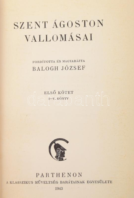 [Aurelius Augustinus (354-430)]: Szent Ágoston vallomásai I. kötet. (I... https://www.darabanth.com/en/477-Online-auction/477.0/Books/Books-Religion~2000032/Aurelius-Augustinus-354-430-Szent-Agoston-vallomasai-I-kotet-I-kotet-I-V-konyv-For~II3254007
