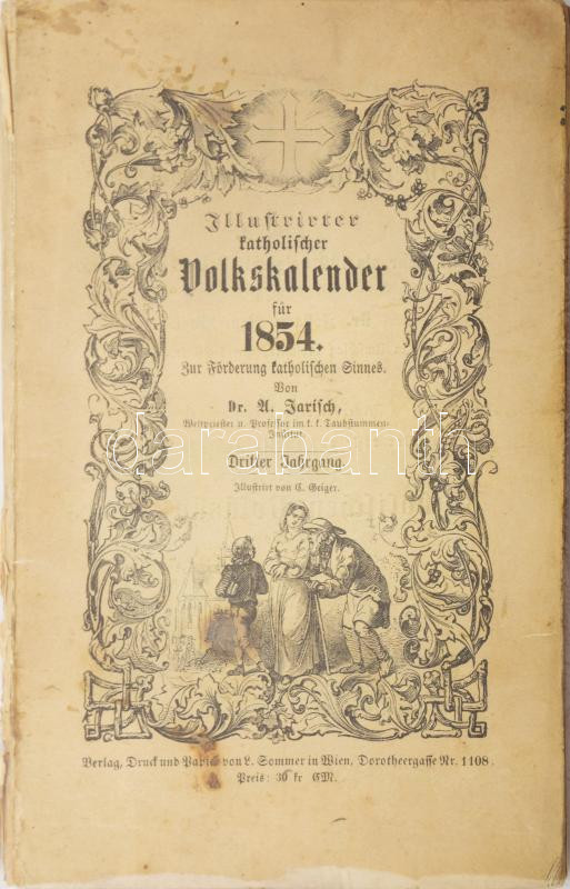 Description: Illustrirter Katholischer Volkskalender 1854. Zur Förderung Katholischen Sinnes. Von: Dr. Anton Jarisch. Dritter Jahrgang. Illustrirt von C. Geiger Wien, 1854, Leopold Sommer. Német nyelven. Fekete-fehér illusztrációkkal. A címlapon adóbélyeggel. Kiadói papírkötés, szakadt, foltos borítóval.