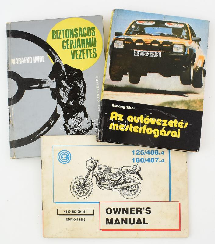 Autókkal, motorokkal kapcsolatos 3 darab könyv. Marafkó Imre: Biztonságos gépjárművezetés. Almássy Tibor: Az autóvezetés mesterfogásai. 1993 Owner's manual CZ motorokhoz.