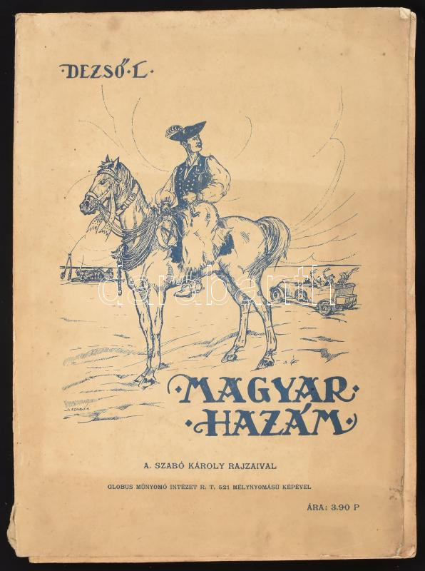 Dezső Lipót: Magyar hazám. Három cserkész barangolása Magyarországon. A magyar tanulók számára írta és a képanyagot összeáll.: - - . A. Szabó Károly rajzaival. Szombathely-Bp., [1935], Martineum Rt. - Globus-ny., 84 p.+ 80 (fekete-fehér képek) t. Második kiadás. Gazdag egészoldalas képanyaggal illusztrálva. Kiadói papírkötés, kissé viseltes, sérült, a könyvtesttől különvált borítóval, kissé sérült, foltos címlappal.