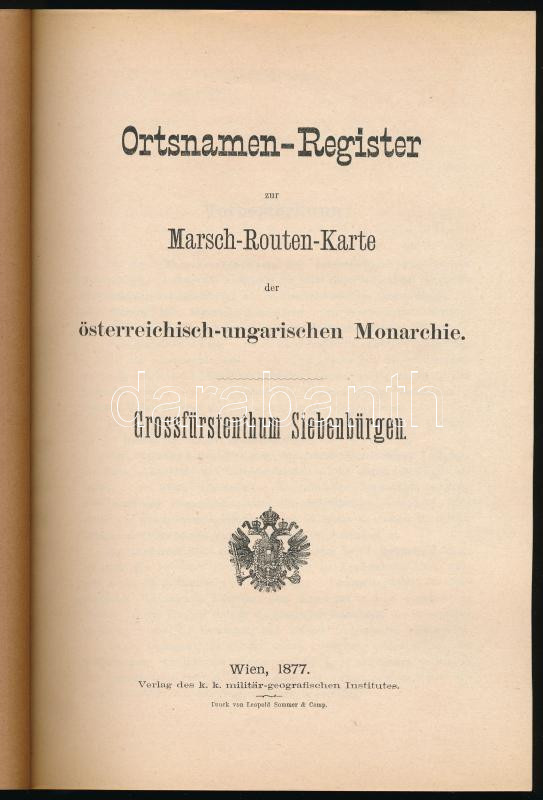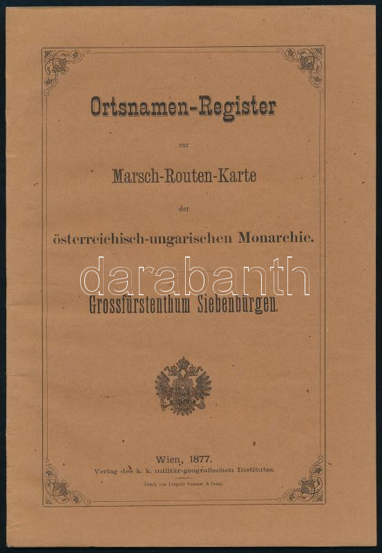 Description: Ortsnamen-Register zur Marsch-Routen-Karte der österreichisch-ungarischen Monarchie. Grossfürstenthum Siebenbürgen. Bécs, 1877, Verlag des k.k Militär-geografischen Instituts. 50 p. Erdélyi helységnevek alfabetikus sorrendben, német és/vagy magyar, részben román nyelven. Kiadó papírkötésben, jó állapotban.