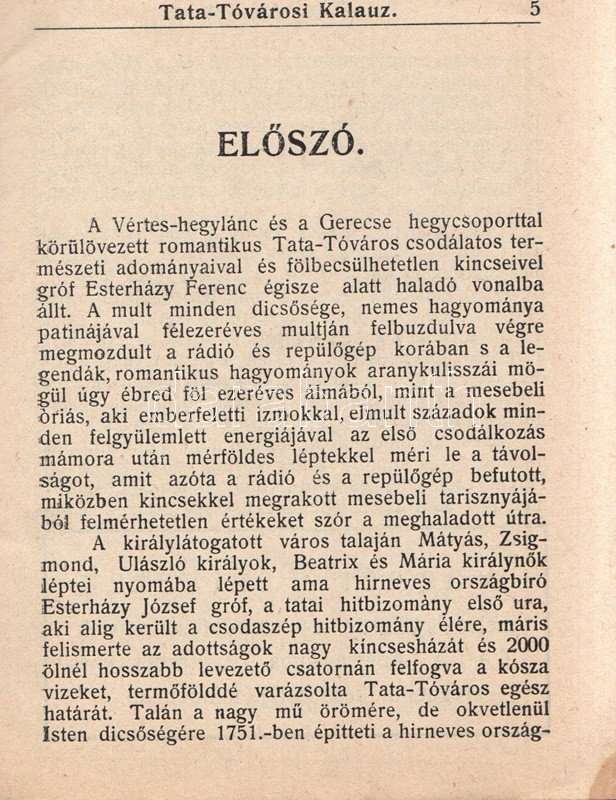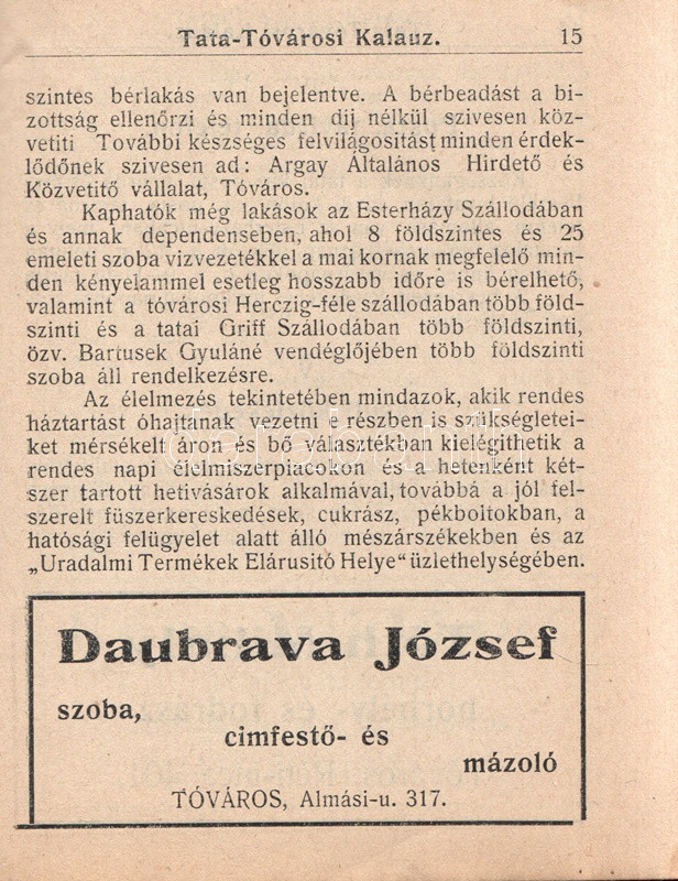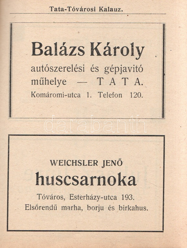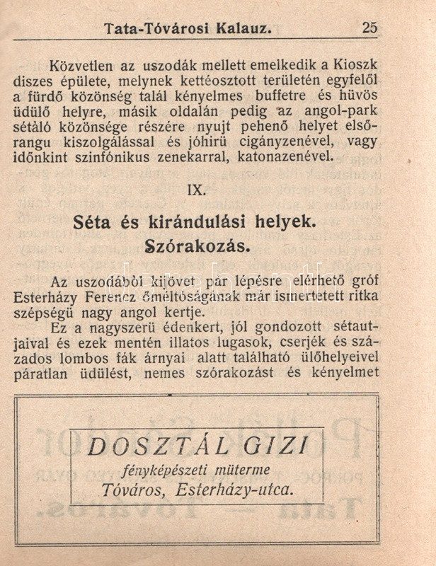 A fővároshoz közel eső népszerű fürdő- és nyaralóhely ismertetője és szaknévsora. Társadalomtörténeti szempontból emlékezetes kiadványunk körvonalazza az 1920-as évek végének tata-tóvárosi szolgáltató- és szórakoztatóiparának volumenét: a fürdőket, a mozikat, a kávéházi kínálatot és a kisipart. A számozatlan oldalakon a helyi cégek hirdetései. Példányunk fűzése enyhén meglazult.