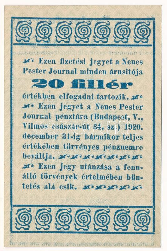 Budapest 1920. 20f "Neues Pester Journal" fizetési jegy, zöldes alapnyomat T:AU Adamo BUC-191.1.5