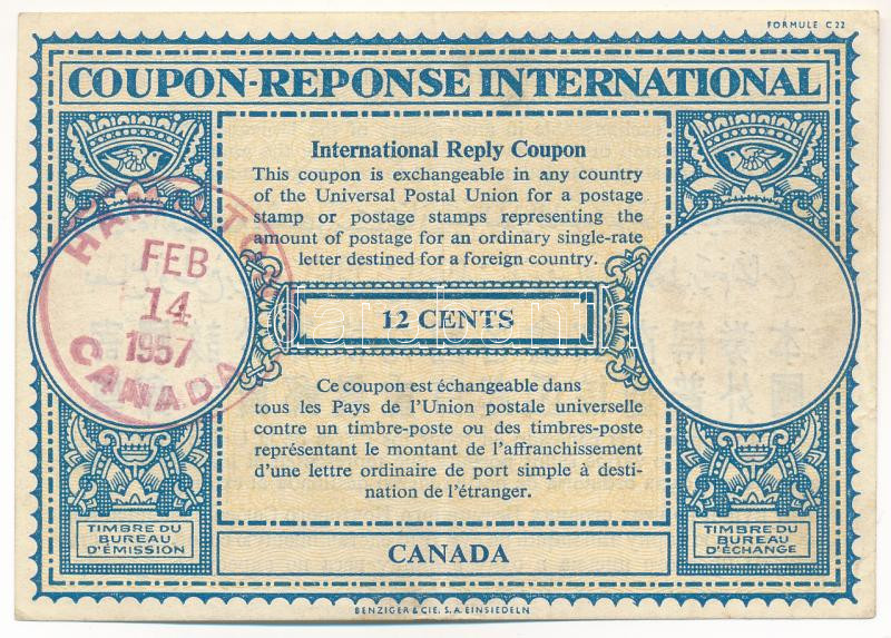 Canada 1957. 12 Cents "UPU International Reply Coupon" C:XF