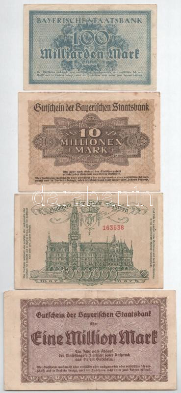 Description: Német Birodalom / Weimari Köztársaság / Bajorország 1923. 1.000.000M - 100.000.000.000M (4xklf) T:F,VG German Empire / Weimar Republic / Bavaria 1922. 1.000.000 Mark - 100.000.000.0000 Mark (4xdiff) C:F,VG