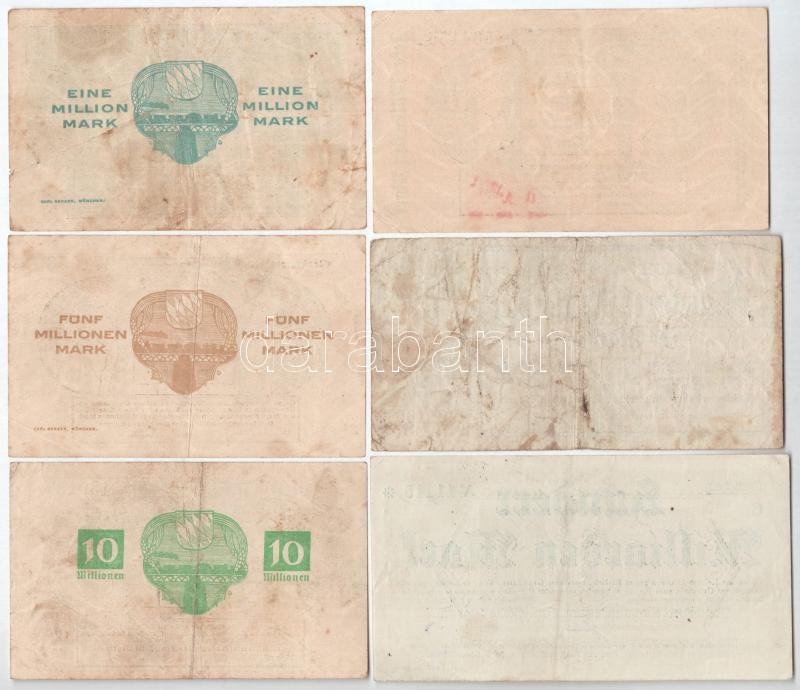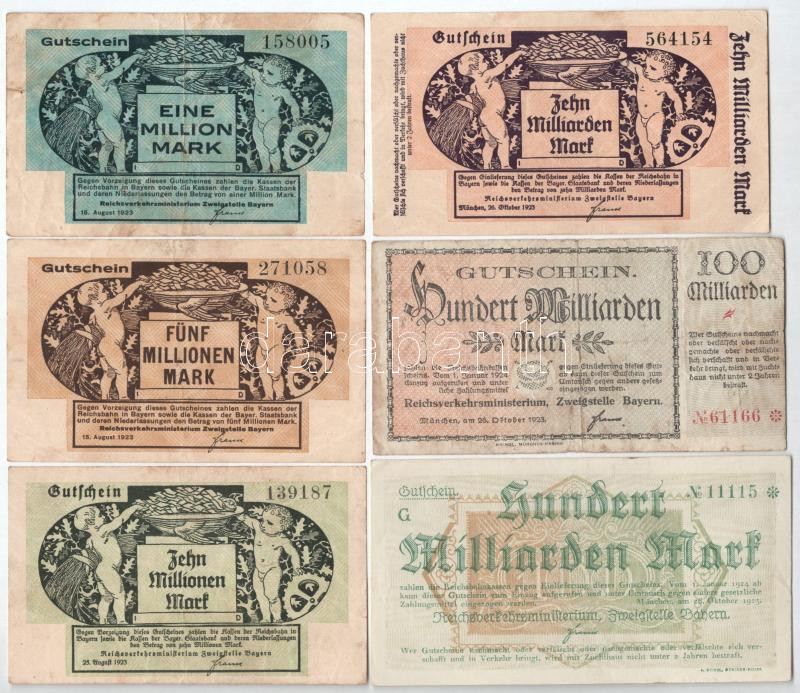 Description: Német Birodalom / Weimari Köztársaság / Bajorország 1923. 1.000.000M - 100.000.000.000M "Birodalmi Közlekedési Minisztérium bajorországi kirendeltsége" (6xklf) T:F,VG German Empire / Weimar Republic / Bavaria 1923. 1.000.000 Mark - 100.000.000.000 Mark "Reichsverkehrsministerium Zweigstelle Bayern (Reich Ministry of Transport Branch Bavaria)" (6xdiff) C:F,VG