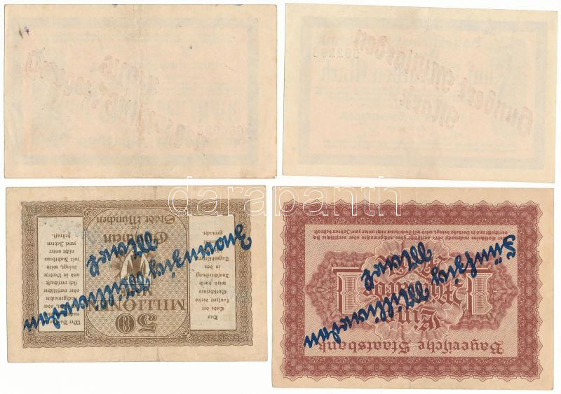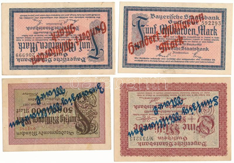 Német Birodalom / Weimari Köztársaság / Bajorország 1923. 50.000.000M "ZWANZIG MILLIARDEN MARK" felülbélyegzéssel + 1.000.000.000M "FÜNFZIG MILLIARDEN MARK" felülbélyegzéssel + 5.000.000.000M "HUNDERT MILLIARDEN MARK" felülbélyegzéssel (2db) T:F közte szép papír