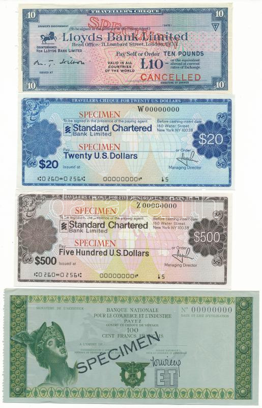 Vegyes utazási csekk minta tétel, közte Amerikai Egyesült Államok DN 20$ + 500$ "Standard Chartered Bank Limited" + Nagy Britannia DN 10P "Lloyd Bank Limited" + Franciaország DN 100Fr "Banque Nationale de Paris" T:AU-XF