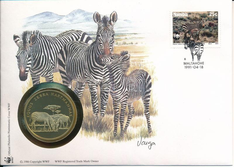 Namíbia DN (1991) "A Világ Vadvédelmi Alap (WWF) 30. évfordulója - Equus Zebra Hartmannae (Hartmann-hegyizebra)" kétoldalas fém emlékérem érmés borítékban, bélyeggel és bélyegzéssel, német nyelvű ismertetővel T:UNC (eredetileg PP) patina