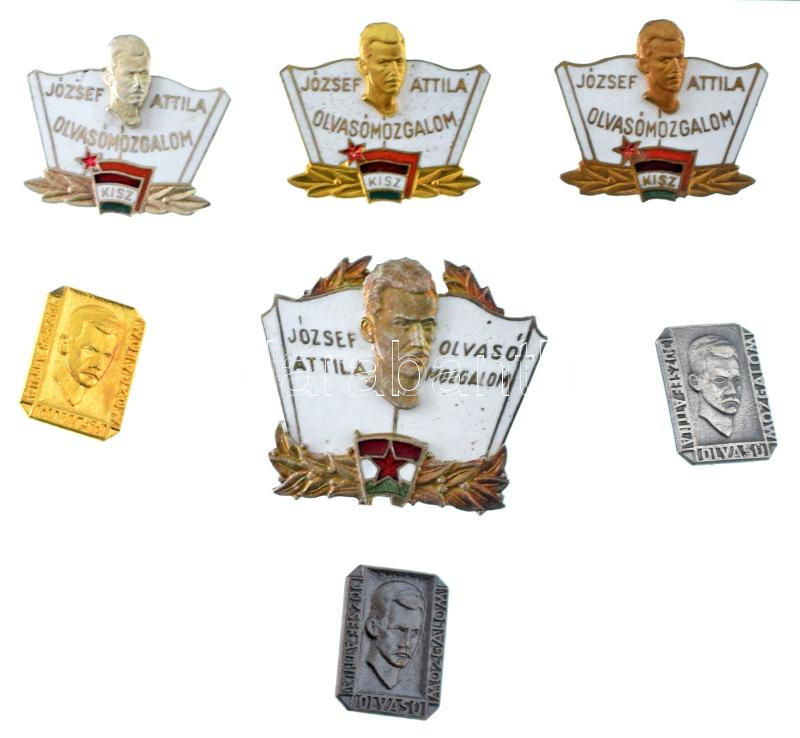 ~1960-1970. "József Attila Olvasómozgalom - KISZ" zománcozott bronz jelvény (4xklf, benne aranyozott, ezüstözött és bronz) + 1960-1970. "József Attila Olvasó Mozgalom" bronz jelvény (3xklf, benne aranyozott, ezüstözött és bronz) T:AU,XF