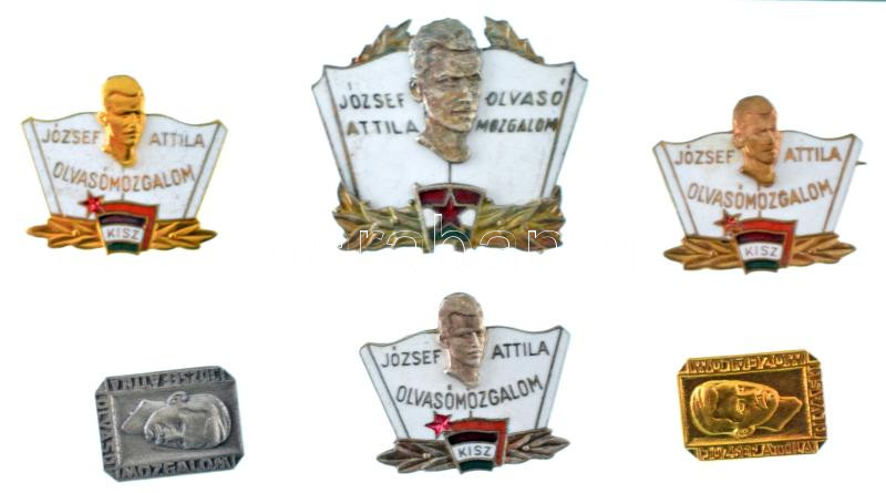 ~1960-1970. "József Attila Olvasómozgalom - KISZ" zománcozott bronz jelvény (4xklf, benne aranyozott, ezüstözött és bronz) + 1960-1970. "József Attila Olvasó Mozgalom" bronz jelvény (2xklf, benne aranyozott és ezüstözött) T:AU,XF