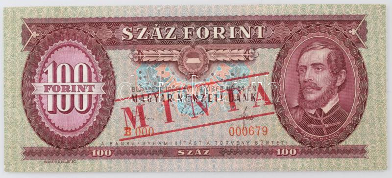 Description: 1968. 100Ft piros "MINTA" felülnyomással és perforációval "B000 000679" sorszámmal, nyomdai papírráncokkal T:AU / Hungary 1968. 100 Forint with "MINTA (SPECIMEN)" overprint and perforation, with "B000 000679" serial number, with printing creases C:AU Adamo F32Ma