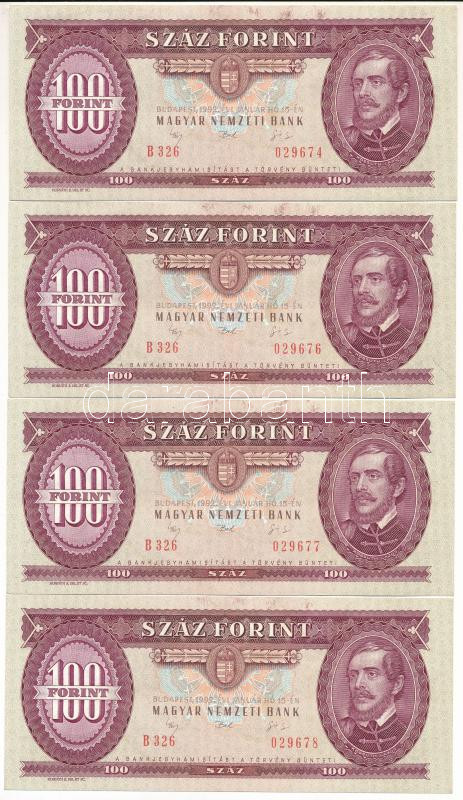 1992. 100Ft (4x) sorszámkövetők és egyugrásos sorszámkövető "B 326 029674 - B 326 029678" mindegyiken nyomdai festékfoltok T:F szép papír Adamo F37