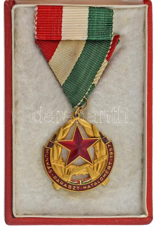 1957. "Munkás-Paraszt Hatalomért Emlékérem" aranyozott, zománcozott bronz kitüntetés mellszalagon, szalagsávval, eredeti tokban T:AU