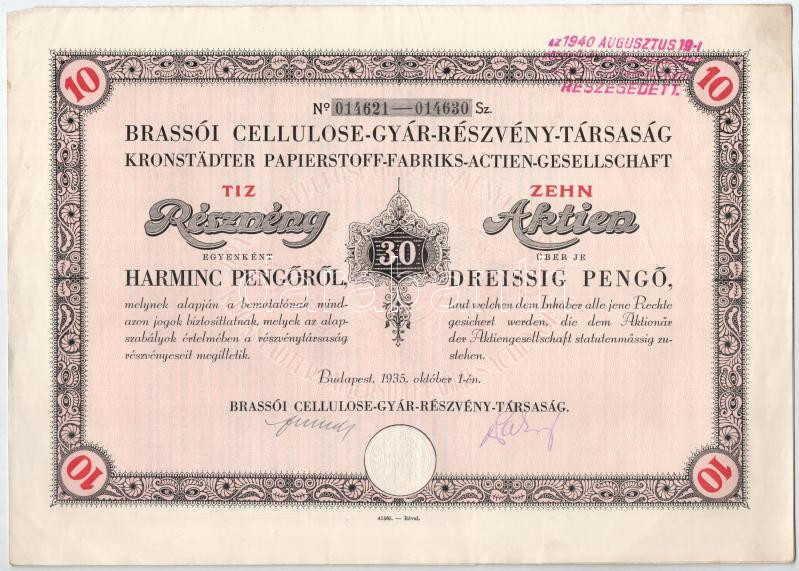 Description: Budapest 1935. "Brassói Cellulose-Gyár-Részvény-Társaság" 10db részvénye egyben, egyenként 30P-ről, német és magyar nyelven bélyegzéssel, szárazpecséttel, szelvényekkel T:F