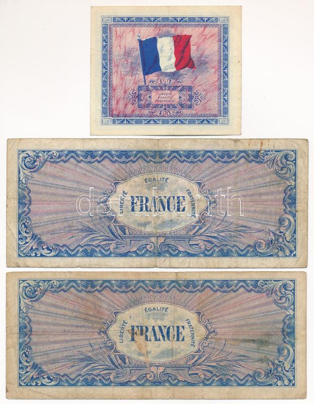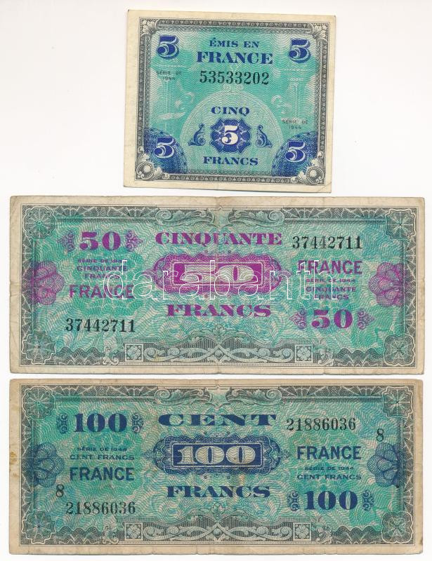 Franciaország / Szövetséges katonai kiadás 1944. 5Fr + 50Fr + 100Fr T:... https://www.darabanth.com/en/477-Online-auction/477.0/Numismatics/Worldwide-banknotes~500016/Franciaorszag-Szovetseges-katonai-kiadas-1944-5Fr-plus-50Fr-plus-100Fr-TF-VG-France-Allied-milit~II3245437