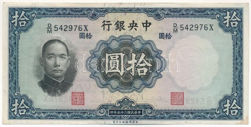 Kína 1936. 10Y "Central Bank of China" "5-ös aláírás&qu... https://www.darabanth.com/en/477-Online-auction/477.0/Numismatics/Worldwide-banknotes~500016/Kina-1936-10Y-Central-Bank-of-China-5-os-alairas-TF-szep-papir-China-1936-10-Yuan-Cen~II3251120