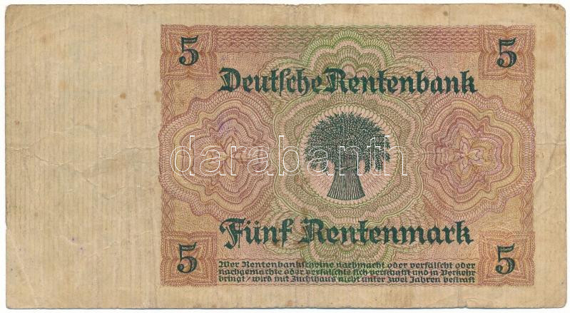 Németország / Weimari Köztársaság 1926. 5M "K 17651510" T:F,VG Germany / Weimar Republic 1926. 5 Rentenmark "K 17651510" C:F,VG Krause P#169