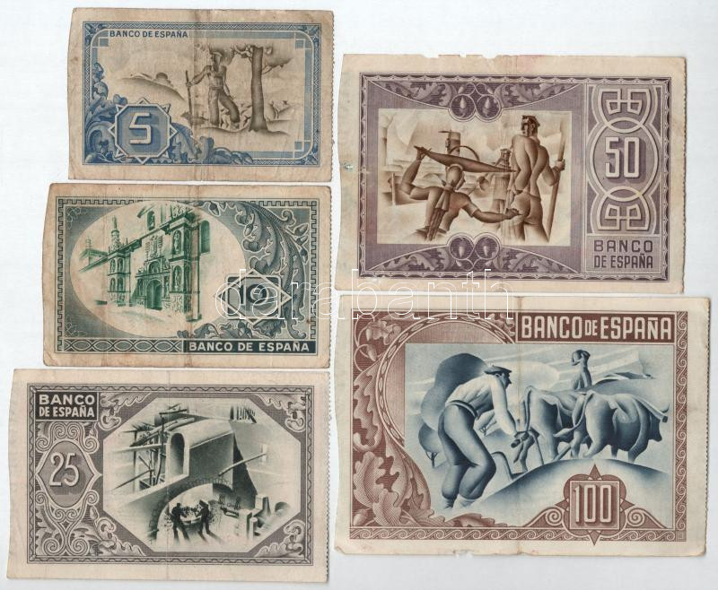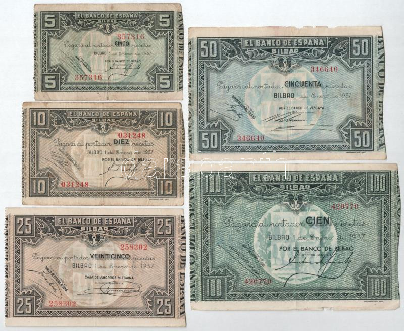 Spanyolország / Polgárháború / Bilbao 1937. 5P-100P (5xklf) T:F egyik ... https://www.darabanth.com/en/477-Online-auction/477.0/Numismatics/Worldwide-banknotes~500016/Spanyolorszag-Polgarhaboru-Bilbao-1937-5P-100P-5xklf-TF-egyik-szelen-kis-papirhianyo~II3245388