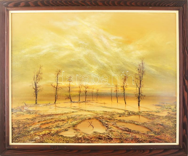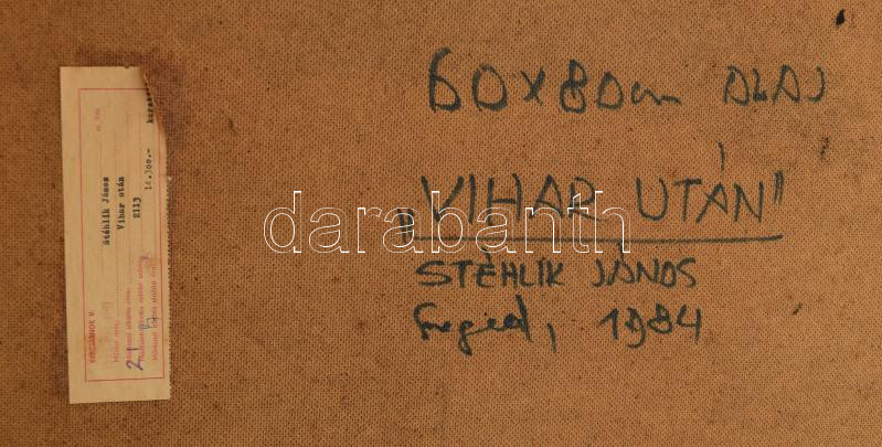Stéhlik János (1942-2021): Vihar után, 1984. Olaj, farost, jelzett. Há... https://www.darabanth.com/en/477-Online-auction/477.0/Paintings-and-graphics/Paintings-and-graphics~1000011/Stehlik-Janos-1942-2021-Vihar-utan-1984-Olaj-farost-jelzett-Hatoldalan-autograf-felira~II3242384
