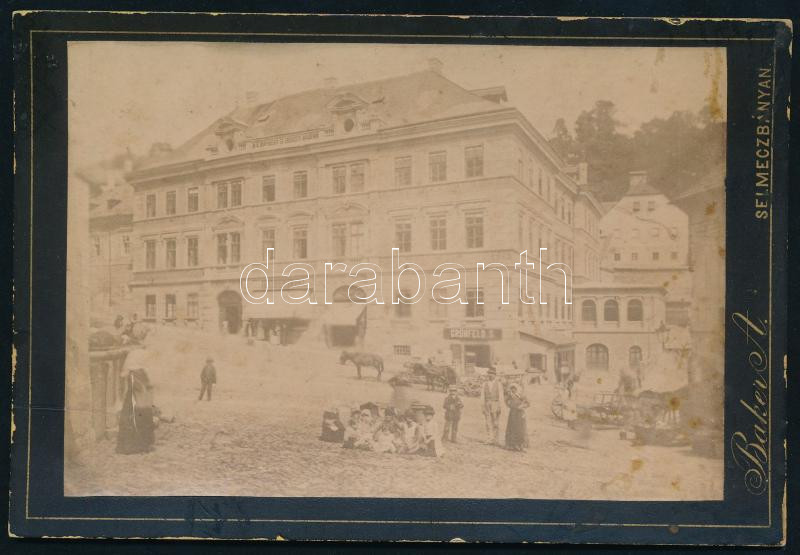 Description: 1890 Selmecbánya (Felvidék) központi része a M. Kir. Bányászat és Erdészeti Akadémiával, Grünfeld A. üzletével, Baker Alajos keményhátú fotója, kissé foltos, 10,5×16,5 cm
