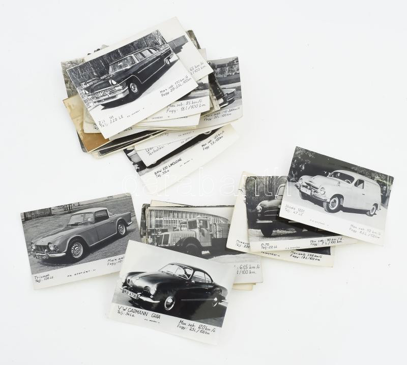 40 db retró autós kép, műszaki adatokkal, az Ofotért kiadása, 7x5 cm + 7 db autókat, járműveket ábrázoló fotó, 6x3,5 cm és 9,5x6,5 cm között