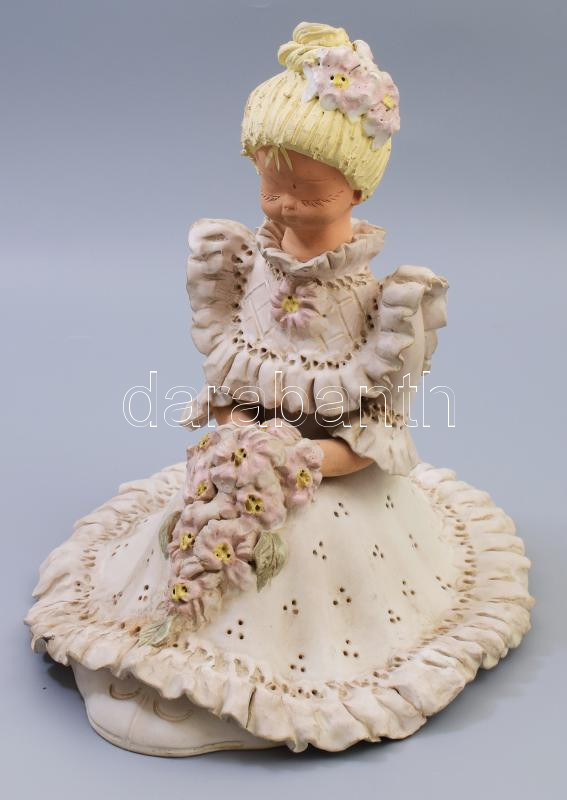 Újpál György: Lány virágcsokorral. Mázas kerámia, kézzel festett, hibá...