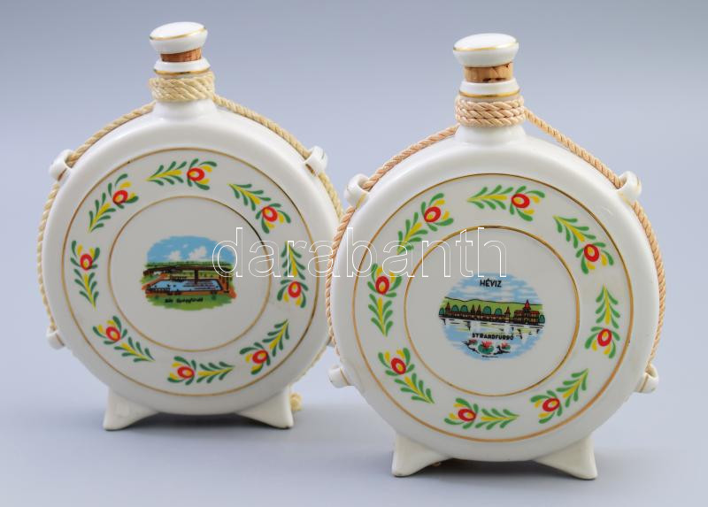 Hollóházi 2 darab kulacs, Hévíz Strandfürdő és Bük Gyógyfürdő ábrázolásokkal. Jelzett, m: 16 cm