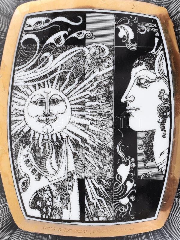 Hollóházi Szász Endre Napfény tálka. Tálka 14x12 cm, Matricás, jelzett, minimális kopással