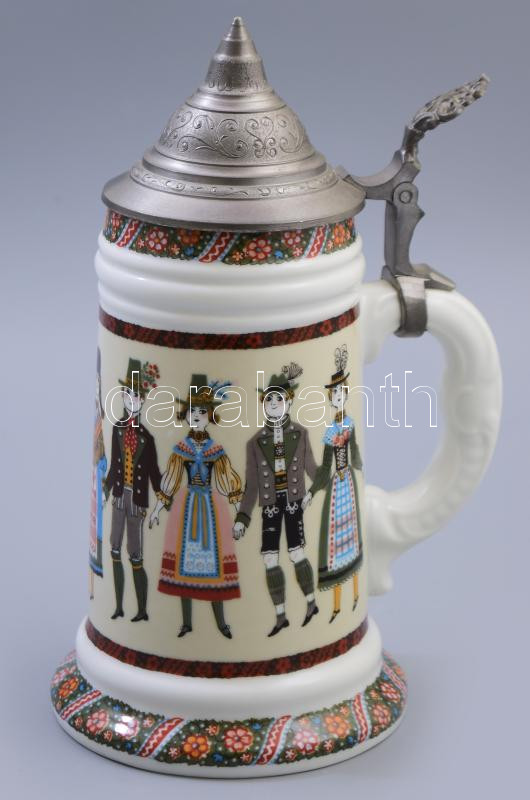 Ünneplő emberekkel díszített ónfedeles porcelán söröskorsó, jelzés nél...