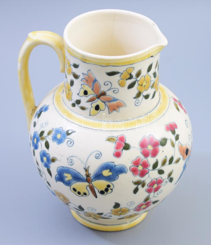 Zsolnay pillangó mintás boroskancsó. 1881 körül, magastüzű mázakkal fedett finomfajansz, jelzett, repedésvonallal, m: 19 cm