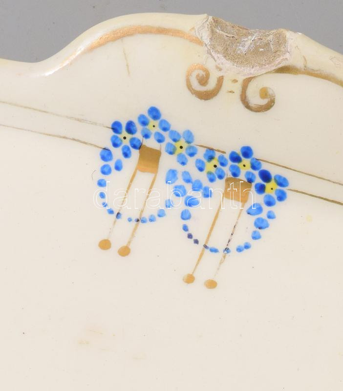 cca 1880-1900, Szecessziós desszertes készlet, tálca és 5 darab tál, jelzés nélkül, kis sérülésekkel, 43x12 cm, 13x13 cm