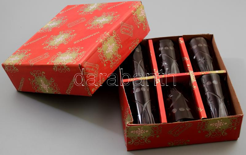Bordó kristály borospohár szett, 6 db, csiszolt mintával, jelzés nélkül, eredeti dobozában, m: 11,5 cm