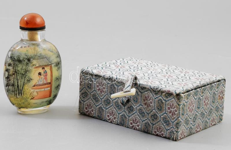 Kínai tubákos üveg, életkép jelenettel díszítve, díszdobozban, m: 8,5 ...