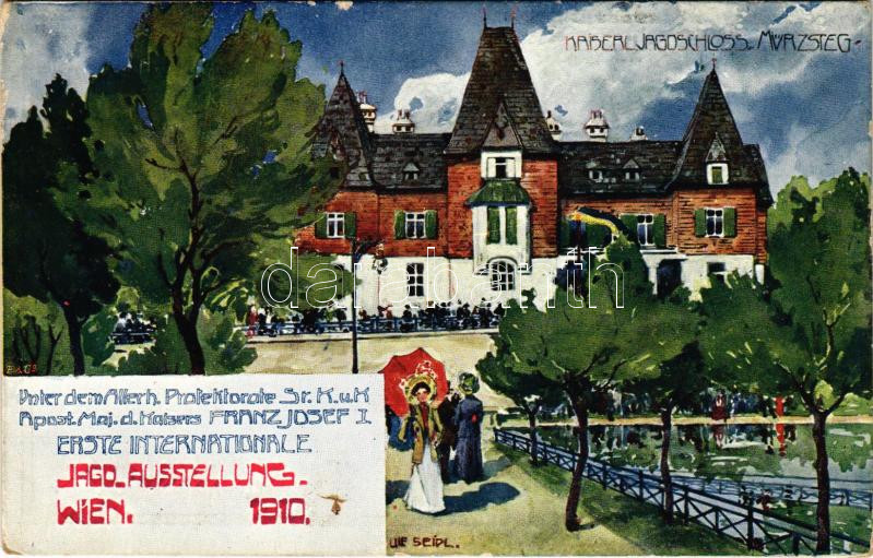 Description: 1910 Wien, Erste Internationale Jagdausstellung. Kaiserliches Jagdschloss Mürzsteg / The First International Hunting Exposition in Vienna. Advertisement art postcard s: Ulf Seidl (Rb)
