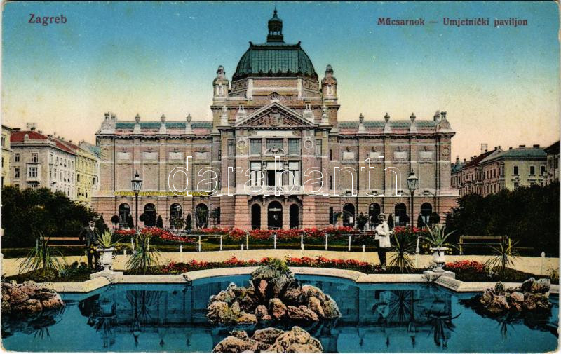 Zagreb, Zágráb; Műcsarnok, Központi kávéház. Vasúti levelezőlapárusítás 38. sz. 1915. / Umjetnicki paviljon, Centrálna Kavana / art gallery, café