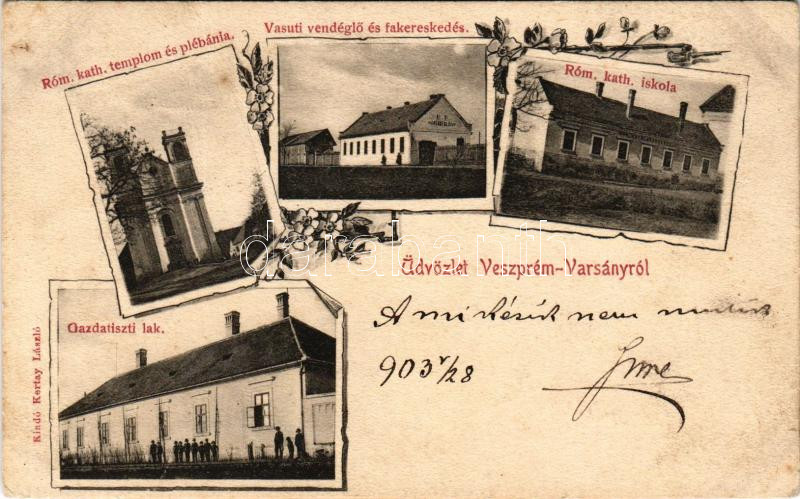 Description: 1903 Veszprémvarsány (Pannonhalma), Római katolikus templom, iskola és paplak, Vasúti vendéglő és fakereskedés, gazdatiszti lak. Kertay László kiadása, Art Nouveau, floral (Rb)