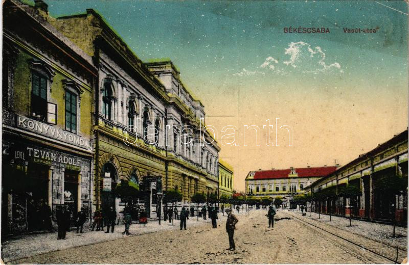 Békéscsaba, Vasút utca, üzletek, Tevan Adolf könyvnyomdája. Vasúti lev...