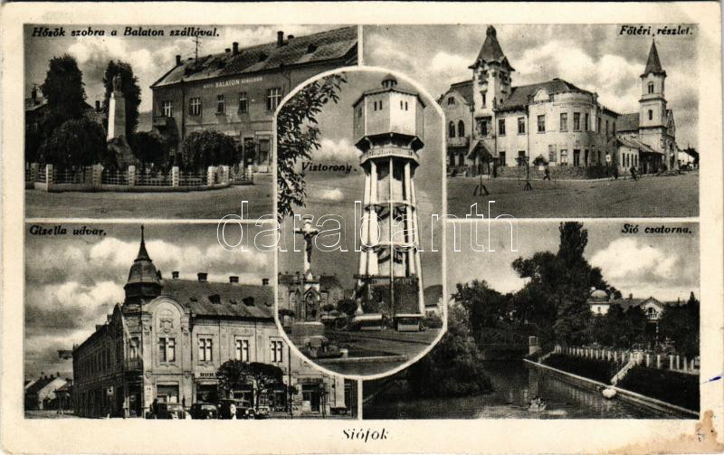 Siófok, víztorony, Gizella udvar, Fő tér, Sió csatorna, Hősök szobra, Balaton szálló (EB)